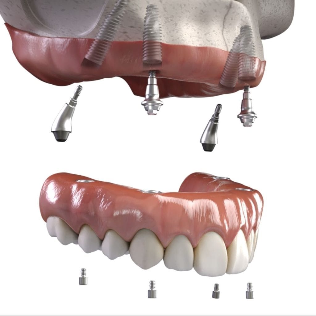 Next, four titanium implants are placed into pre-planned positions in the jawbone under local anesthesia or sedation. Two implants are positioned in the front, and two are placed at an angle in the back for added support. Temporary prosthetic teeth are usually attached immediately. This allows you to leave the clinic with a functional smile the same day.